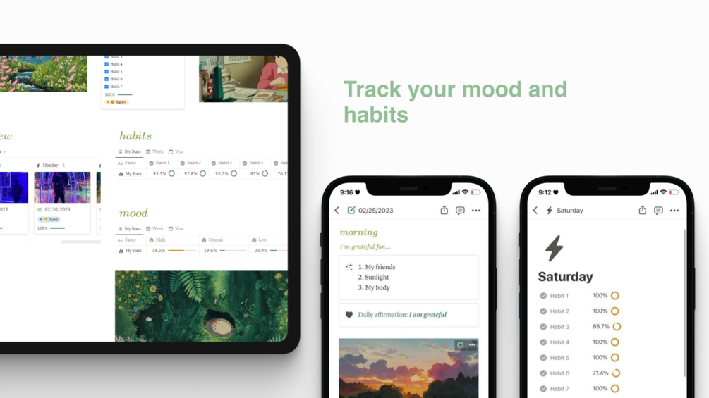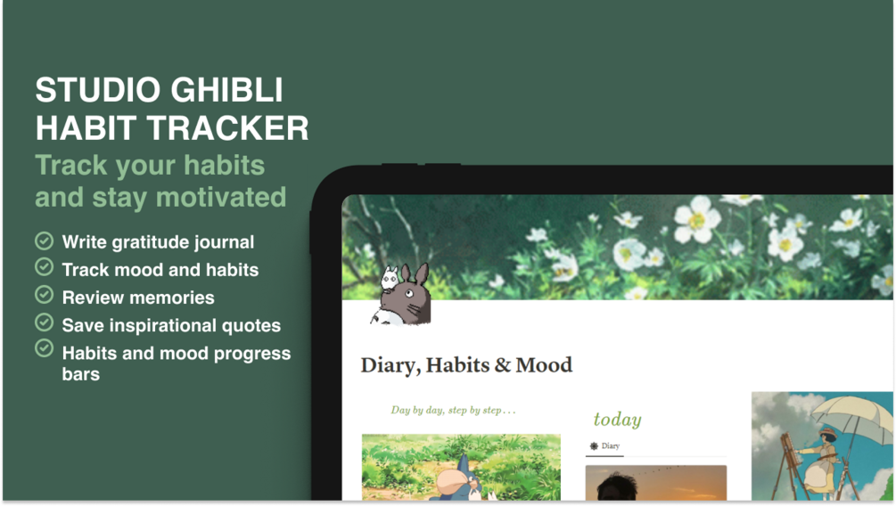 I was inspired to create this habit tracker because I wanted to take some of the magic of Studio Ghibli and put it on Notion. This habit tracker is a simple tool that helps you keep track of your habits and mood in one place. It makes tracking habits fun by using the images from Studio Ghibli movies as inspiration.